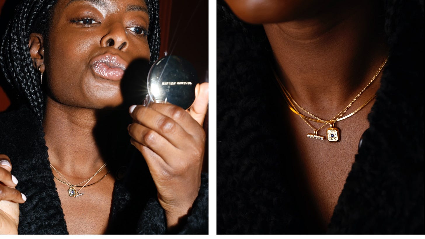 Now for nighttime or party dressing, I tend to layer up. I love a necklace stack - it’s very confident, very London, very ‘oh these old things?’. Hanging on to the t-bar necklace from before, I also added the snake chain that comes as part of that set, as well as this engraveable birthstone pendant necklace. It’s all about balance when it comes to a necklace stack and these three pieces go so well together (I think the formula to aim for is two pendants and one chain - if you’re feeling funky maybe even consider mixing silver and gold?)