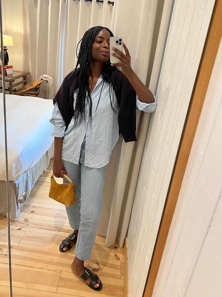 All of which makes resale more and more appealing, especially if you’re not that fussed about having trending ‘It pieces’. Indeed, most of my resale purchases tend to be things I simply overlooked at the time or was slow about buying - like these red asymmetric A.W.A.K.E. Mode mules, which I dilly dallied over during the pandemic and have been trying to track down in my size ever since; or this Rejina Pyo shirt from one of her earliest collections, before I’d even become aware of the brand.